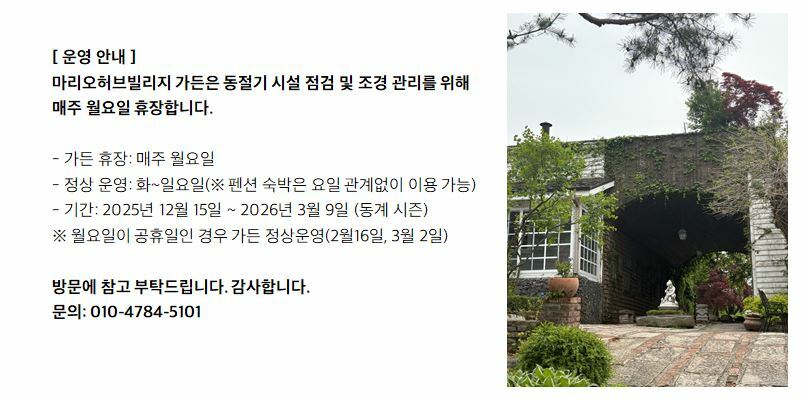 아름다운 자연의 품을 느낄 수 있는 허브빌리지에 방문 예정이신가요? 궁금하신 점이 있으시면 언제든지 문의 주시기 바랍니다. 신속하고 친절하게 답변해 드리겠습니다. 허브빌리지는 방문객들을 위해 다양한 우대 정책과 편의 시설을 제공하고 있습니다.